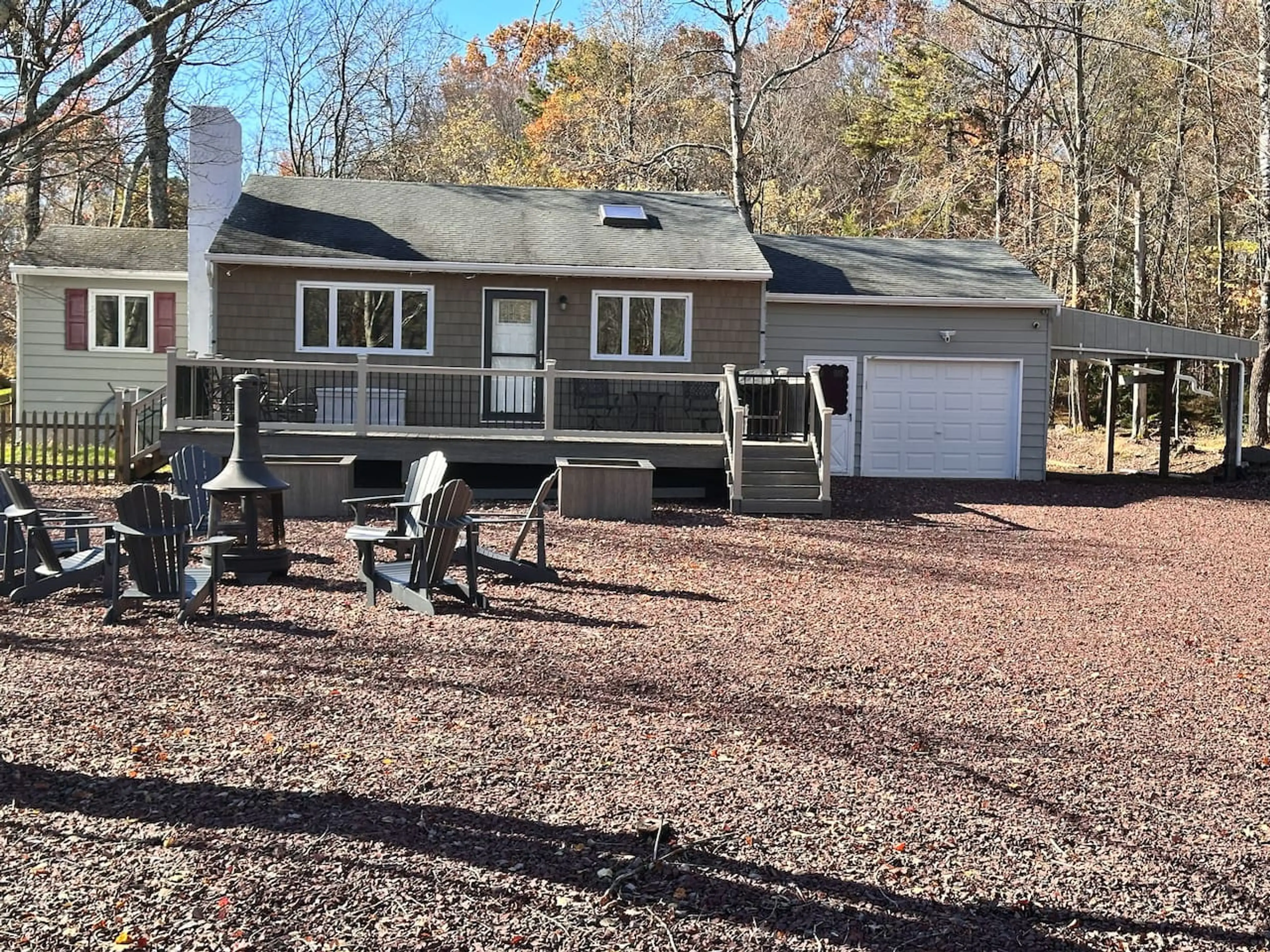 Welcome to "The Lilypad," your perfect getaway in the heart of the Poconos! This pet and family-friendly ranch home features 3 bedrooms and 2 full baths, offering year-round comfort. Enjoy stunning lake views of Lake Shangri La from the front yard firepit, while the back opens to thousands of acres ...